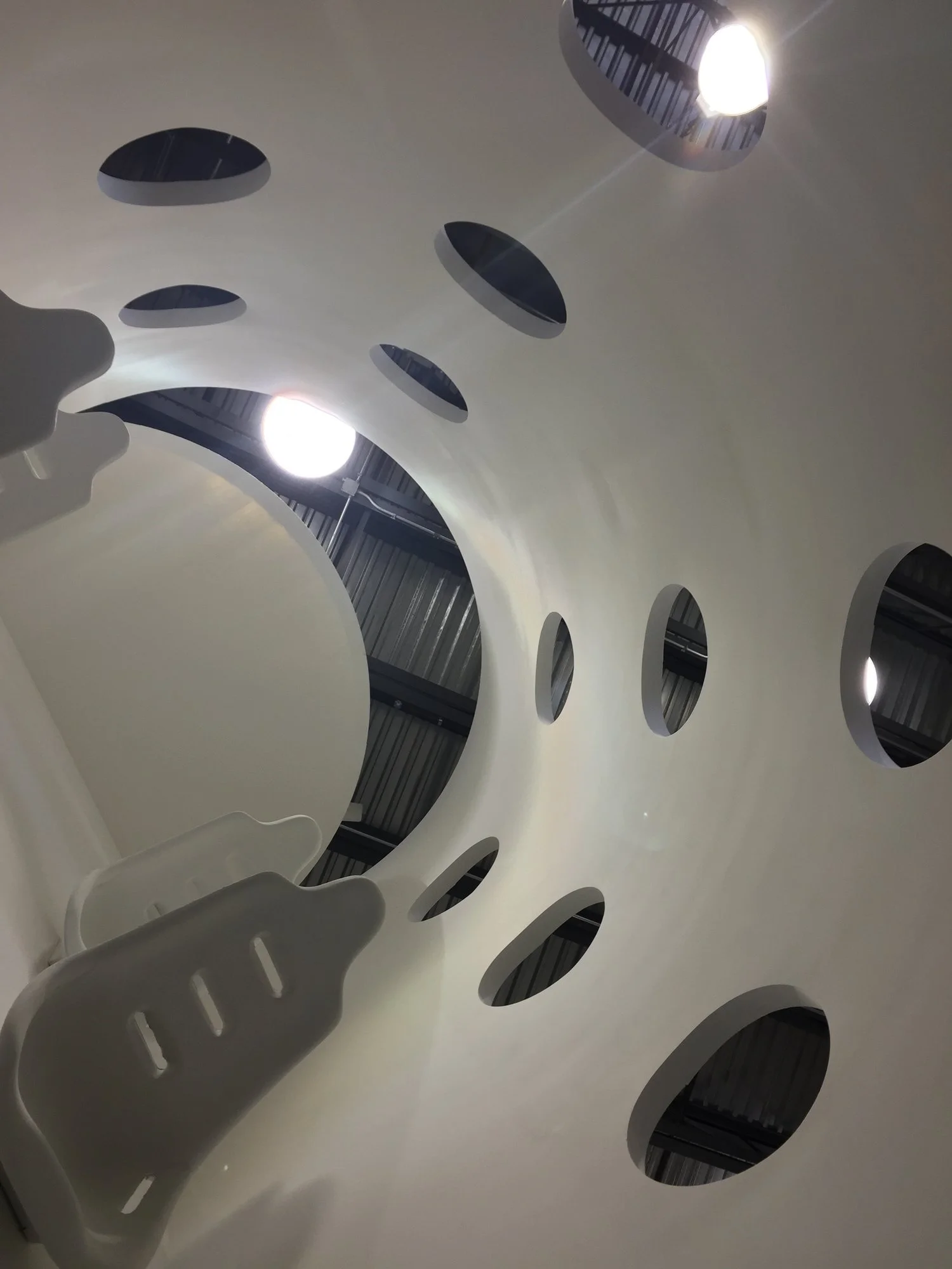 Getting ‘comfortable’ however, took a village. We enlisted production designer extraordinaire Gino Fortebuono to go on an online treasure hunt and dig up the schematics of the Virgin Galactic spaceship itself. Once we unearthed the plans, Gino and his team went straight to working building a plywood cylinder- shaped replica in a warehouse in Queens, New York. The final product measured 25ft x 9ft and was propped up like a sky scraper, or an enormous water bottle with the ends cut off. All that we did next was point the camera from the ground upwards and had our talent repel down toward us, rock climber style! Once we positioned the light to cast the idyllic beams through the portholes and slowed the footage down to 48 fps, the magic was made.